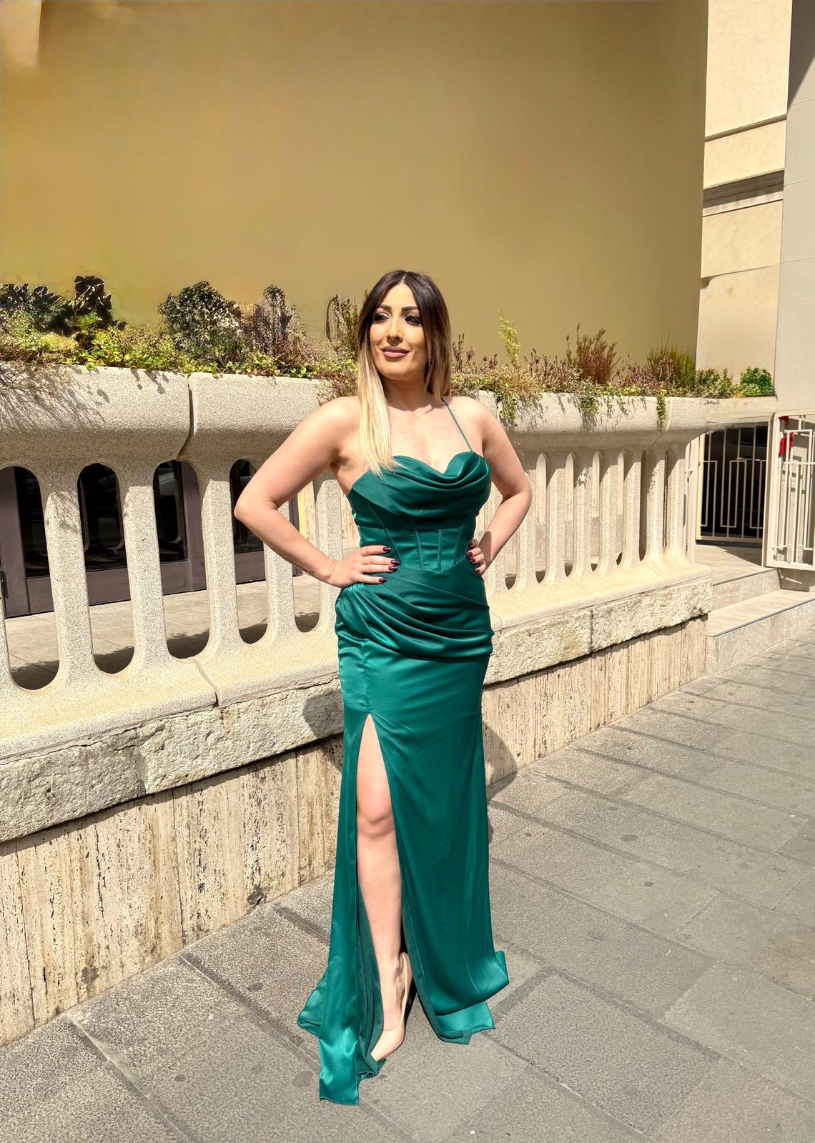 Perfetto per serate speciali, cerimonie o eventi indimenticabili, questo abito è pensato per chi ama sentirsi protagonista con classe, senza rinunciare al comfort di una vestibilità che segue il corpo come una carezza.