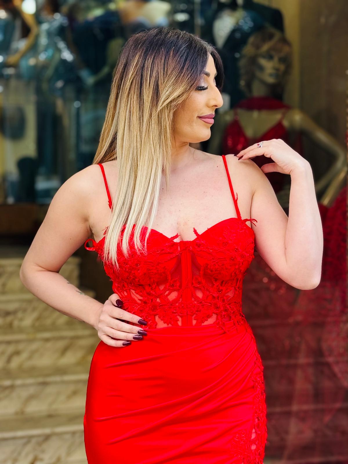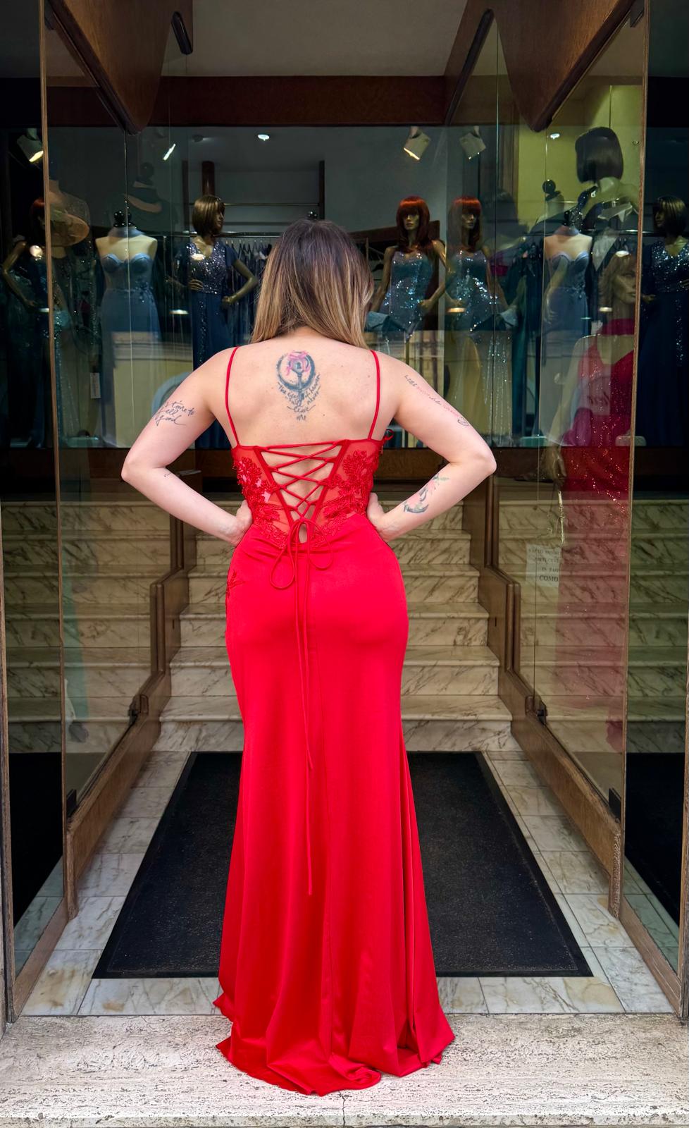 Questo abito a sirena è pensato per valorizzare la femminilità con classe. Il corpetto bustier, trasparente e strutturato, è impreziosito da applicazioni in pizzo che si intrecciano delicatamente sulla schiena, creando un effetto sofisticato e sensuale. La chiusura con cerniera è discreta, integrata nel design per garantire comfort e vestibilità.