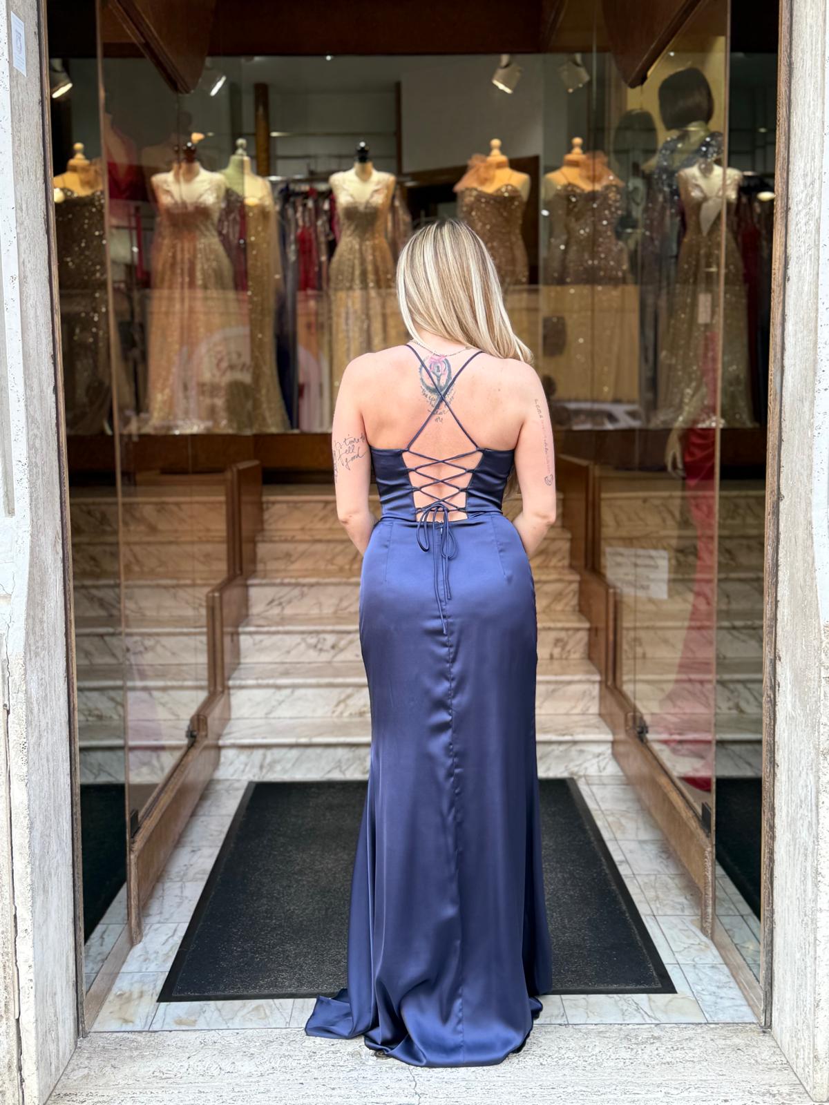 Dietro, un elegante gioco di bretelle incrociate sulla schiena aggiunge un tocco di sensualità raffinata, mentre la gonna drappeggiata scivola morbida lungo i fianchi, aprendosi in un audace spacco laterale che lascia intravedere la pelle con garbo e femminilità.