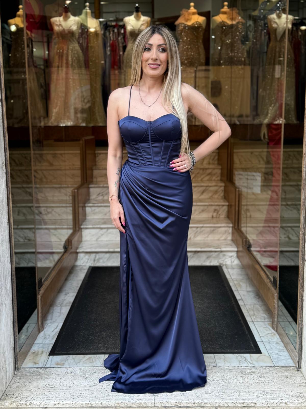 Eleganza e femminilità si incontrano in questo abito a sirena dal scollo a cuore, con bustino strutturato da stecche per un sostegno impeccabile. Le bretelle incrociate sulla schiena donano un tocco sensuale, mentre la gonna drappeggiata con spacco laterale valorizza ogni passo con grazia. Perfetto per brillare con stile e sicurezza nelle occasioni più speciali