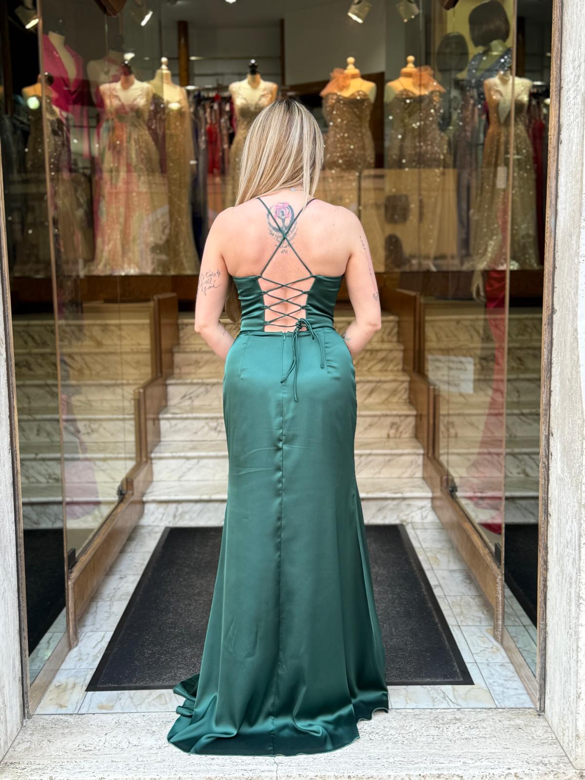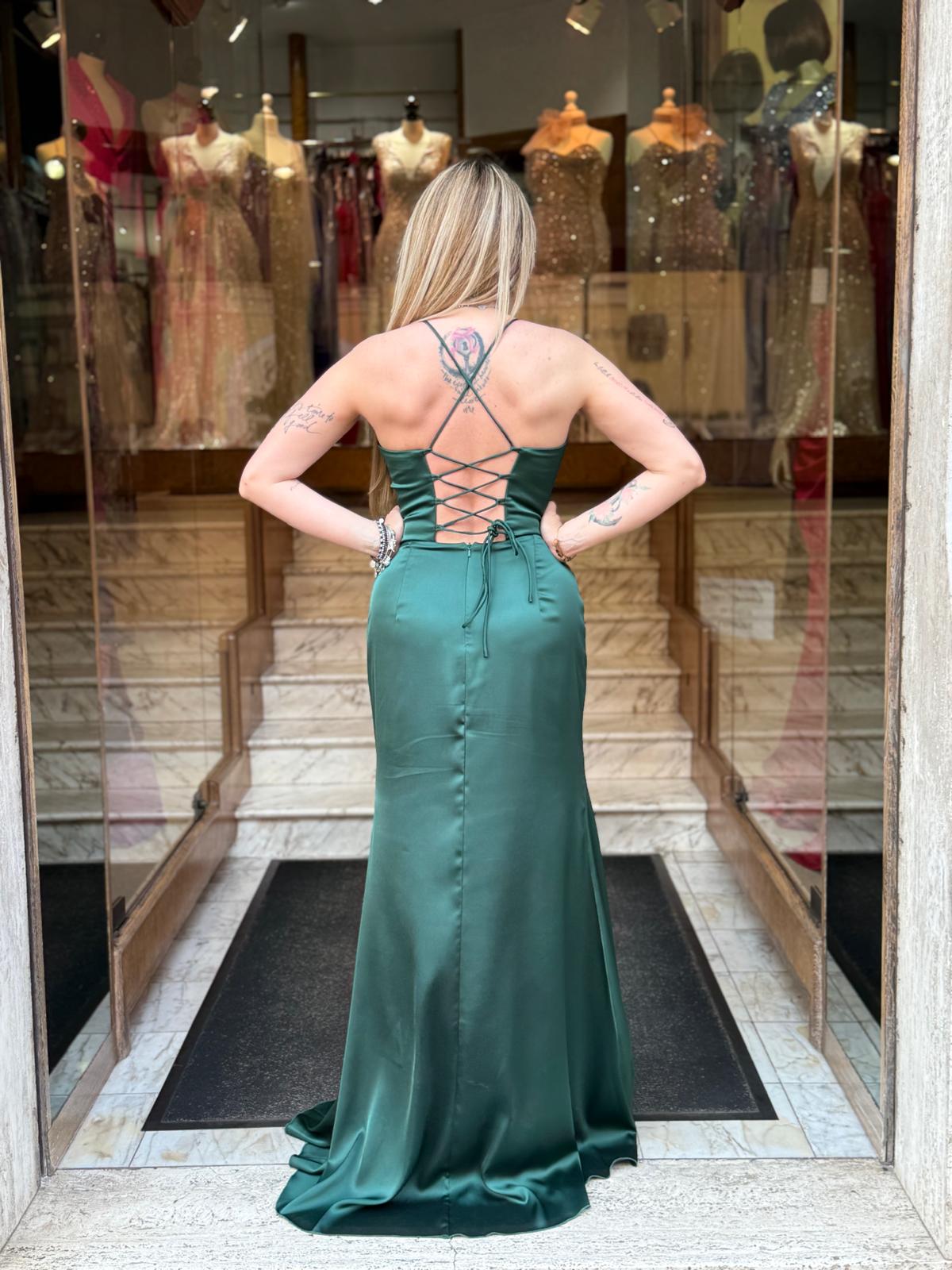 Dietro, un elegante gioco di bretelle incrociate sulla schiena aggiunge un tocco di sensualità raffinata, mentre la gonna drappeggiata scivola morbida lungo i fianchi, aprendosi in un audace spacco laterale che lascia intravedere la pelle con garbo e femminilità.