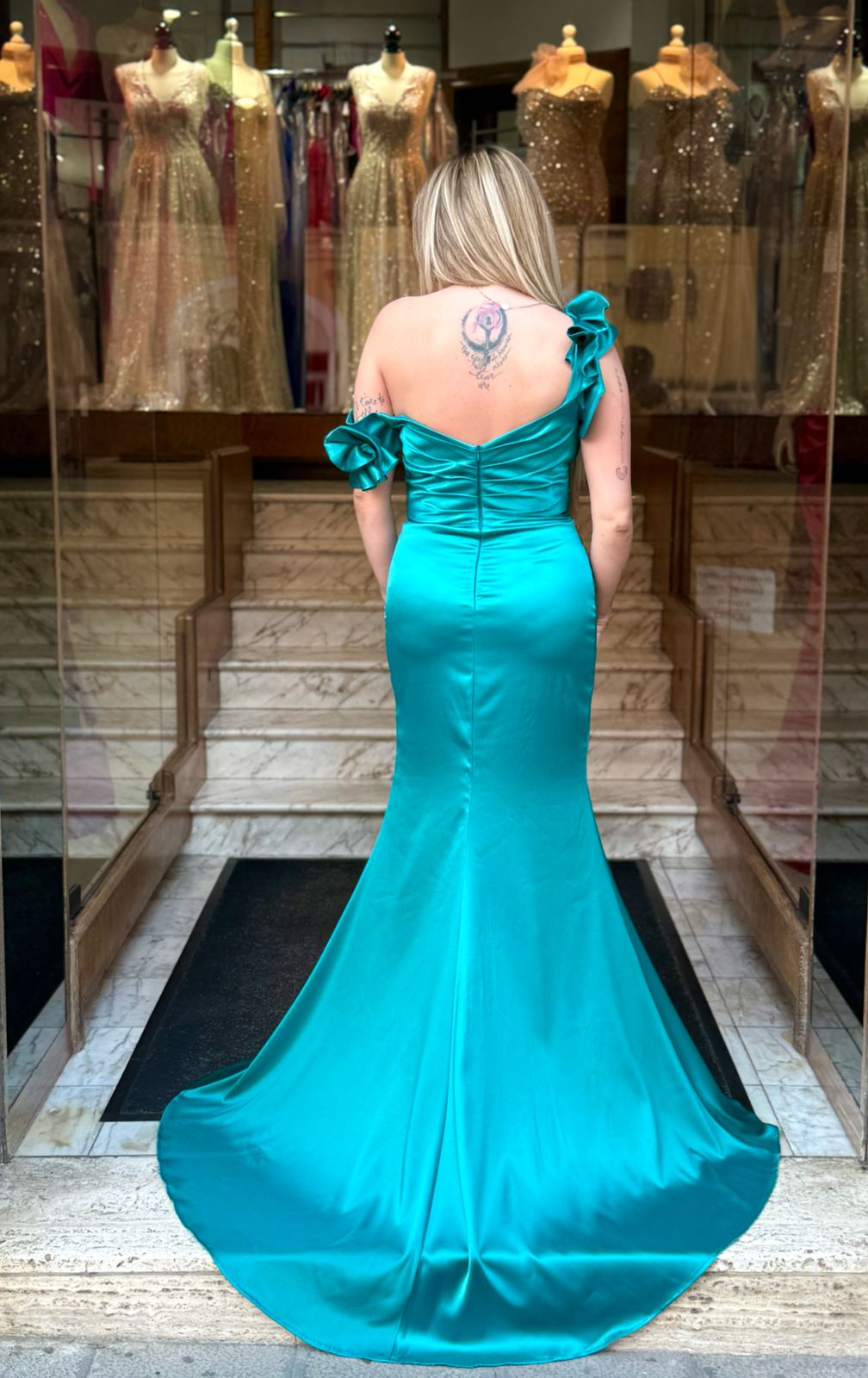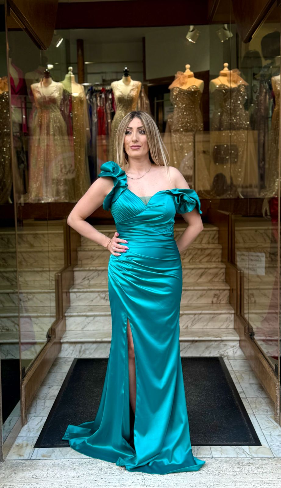 Realizzato in raso lucido, questo abito cattura lo sguardo sin dal primo istante. Il scollo a cuore abbraccia delicatamente il décolleté, mentre le maniche arricciate aggiungono un tocco romantico e femminile. Il corpetto drappeggiato segue con armonia le linee del corpo, esaltando con grazia il punto vita.
