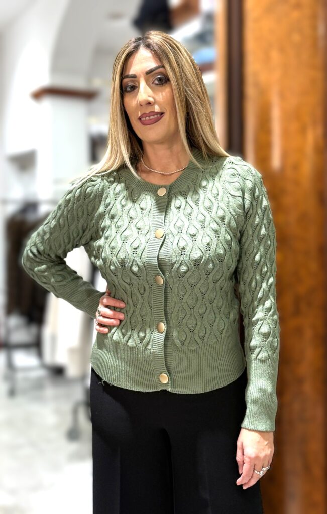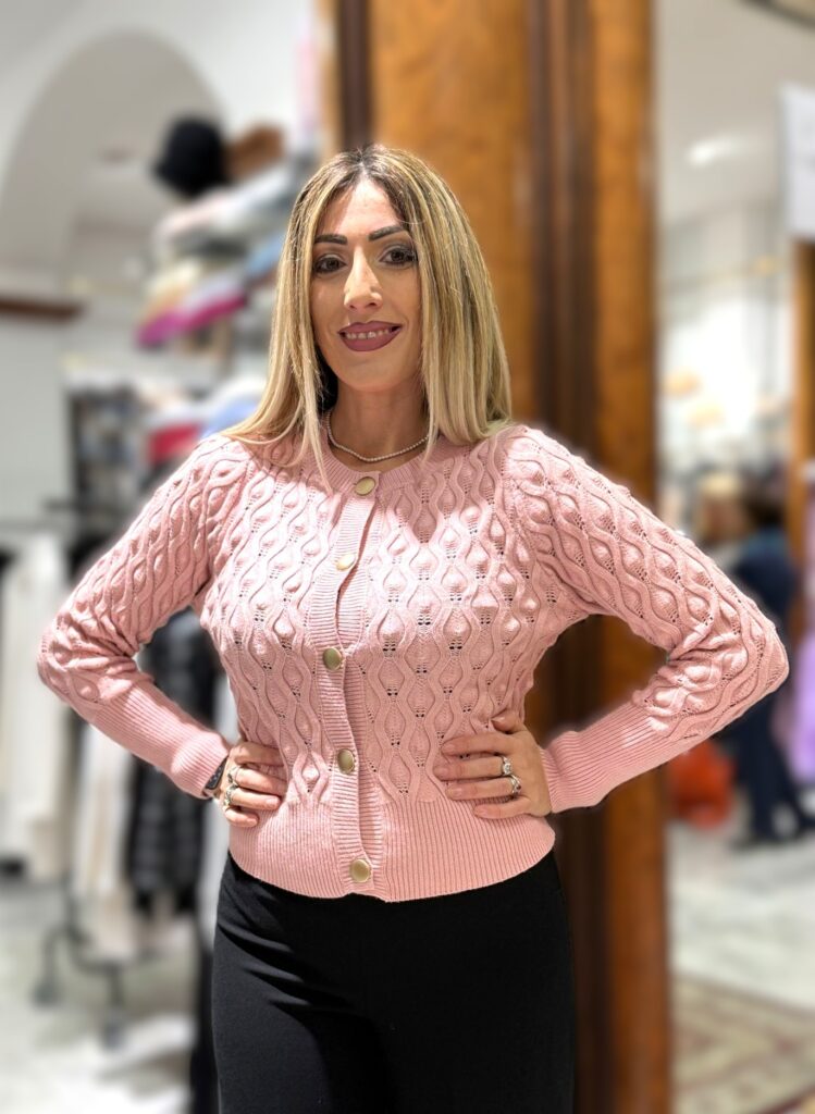 Cappotto corto nero dallo stile deciso e sofisticato. Modello doppiopetto con sei bottoni dorati che donano un tocco luminoso e ricercato. Il rever a lancia sottolinea la linea elegante del collo, mentre le tasche a toppa aggiungono un dettaglio funzionale e di stile. I polsini e le tasche sono impreziositi da pelliccetta decorata con paillettes, per un effetto chic e sorprendente che esalta il look nelle occasioni speciali o nei momenti più glamour della stagione.