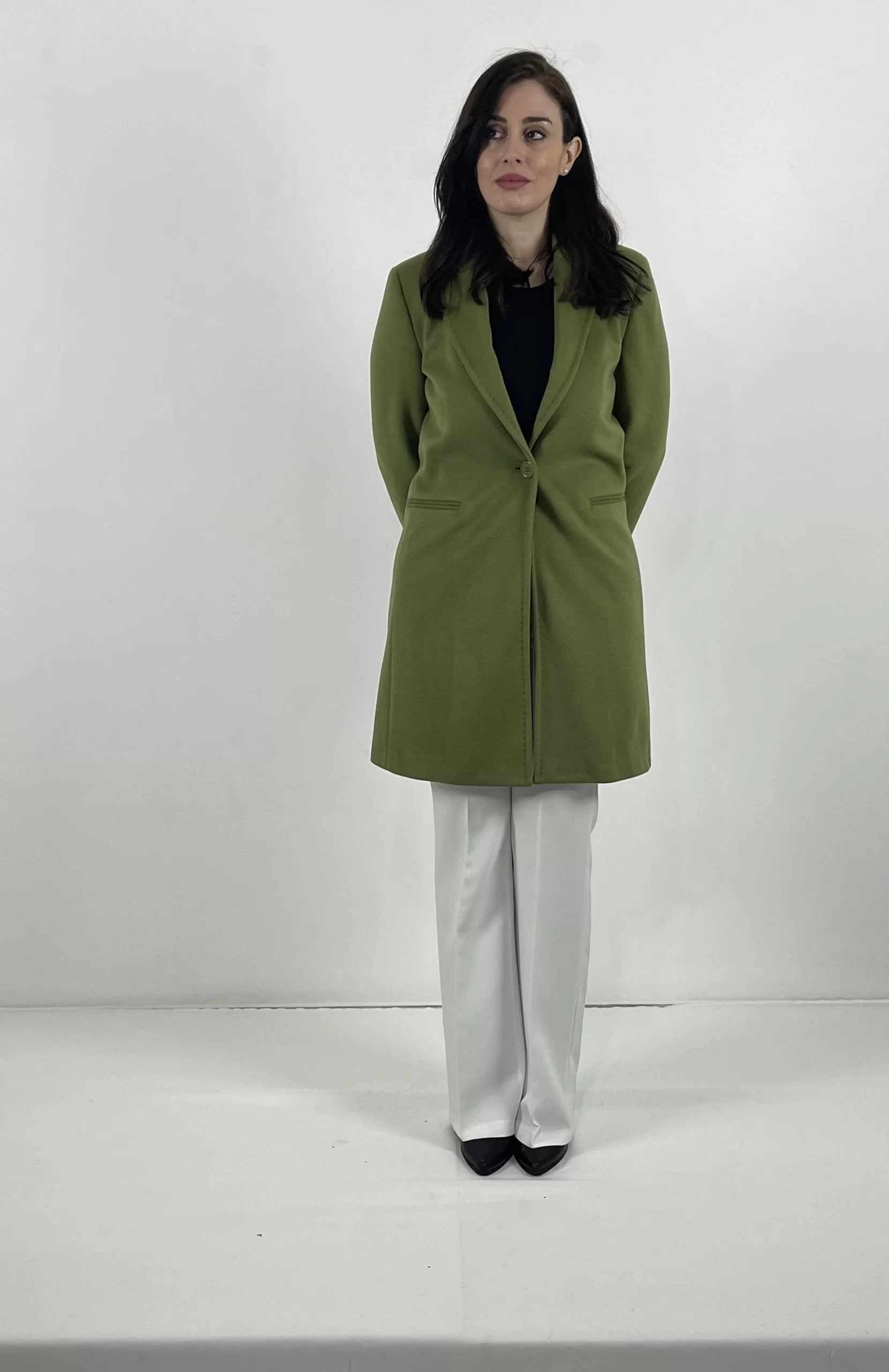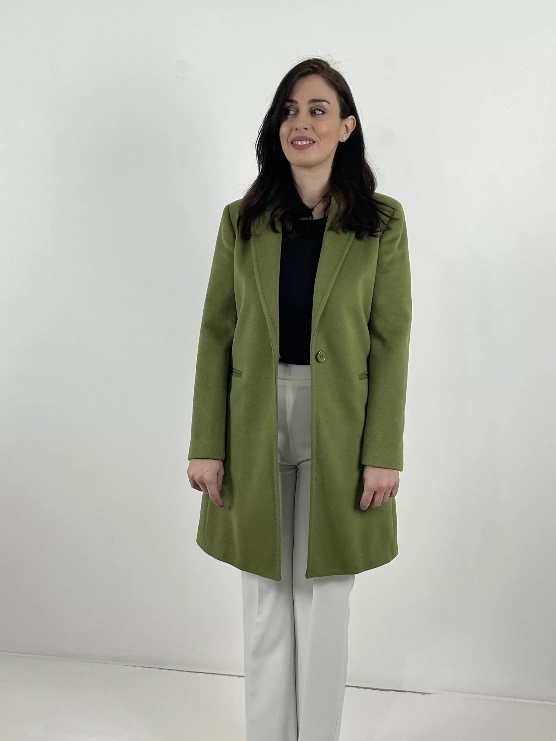 • Cappotto dal taglio maschile, abbottonatura monopetto con unico bottone, collo con reverve a lancia, lunghezza al ginocchio e spacco dietro.