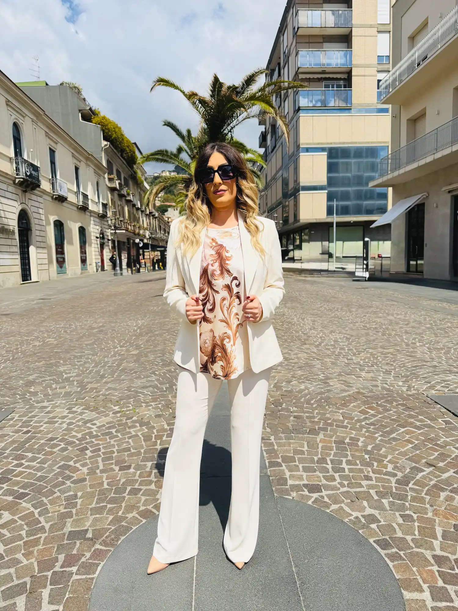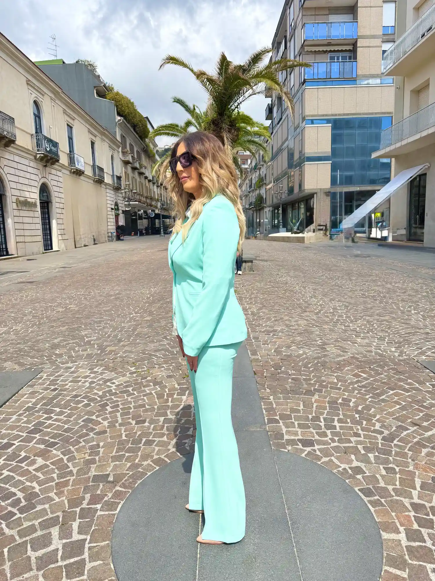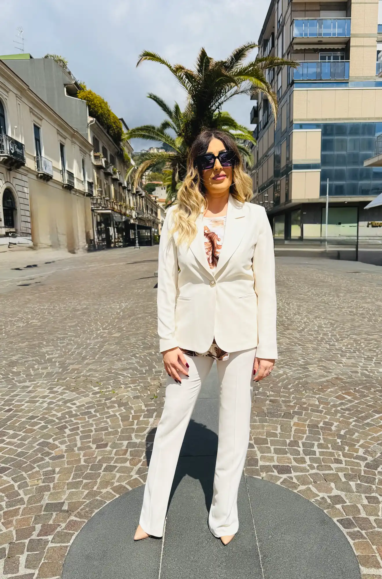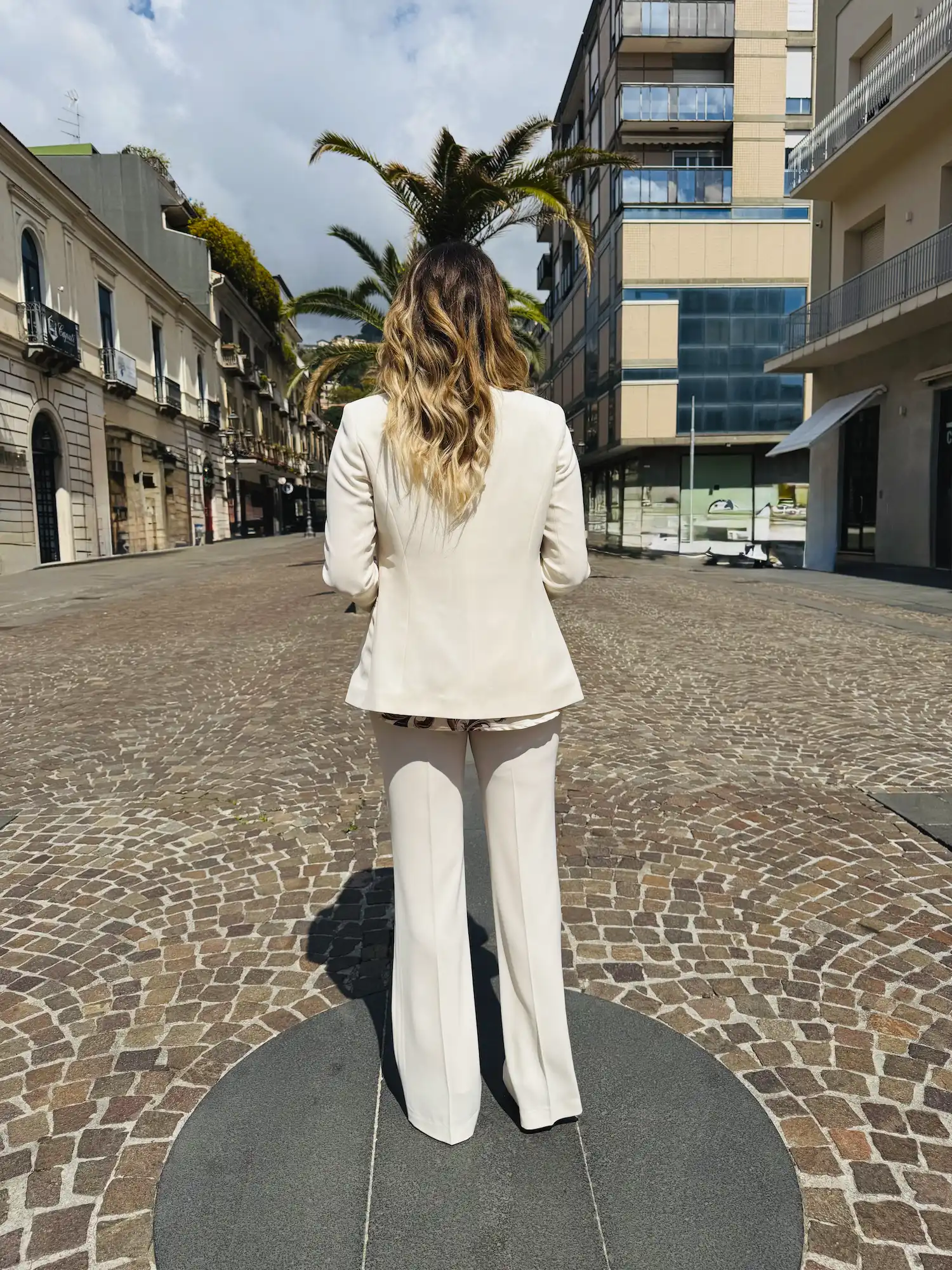 • Tailleur monopetto composto da giacca e pantalone. La giacca, interamente foderata, è caratterizzata da un solo bottone e tasche a filetto. Il pantalone è a vita alta, modello a zampa, senza tasche.