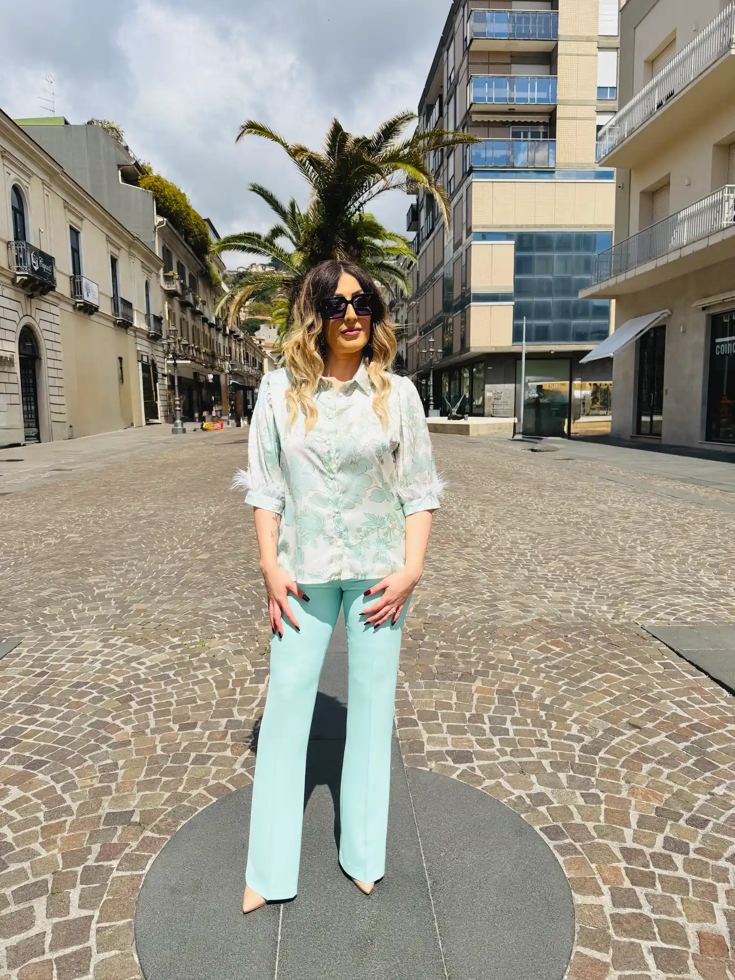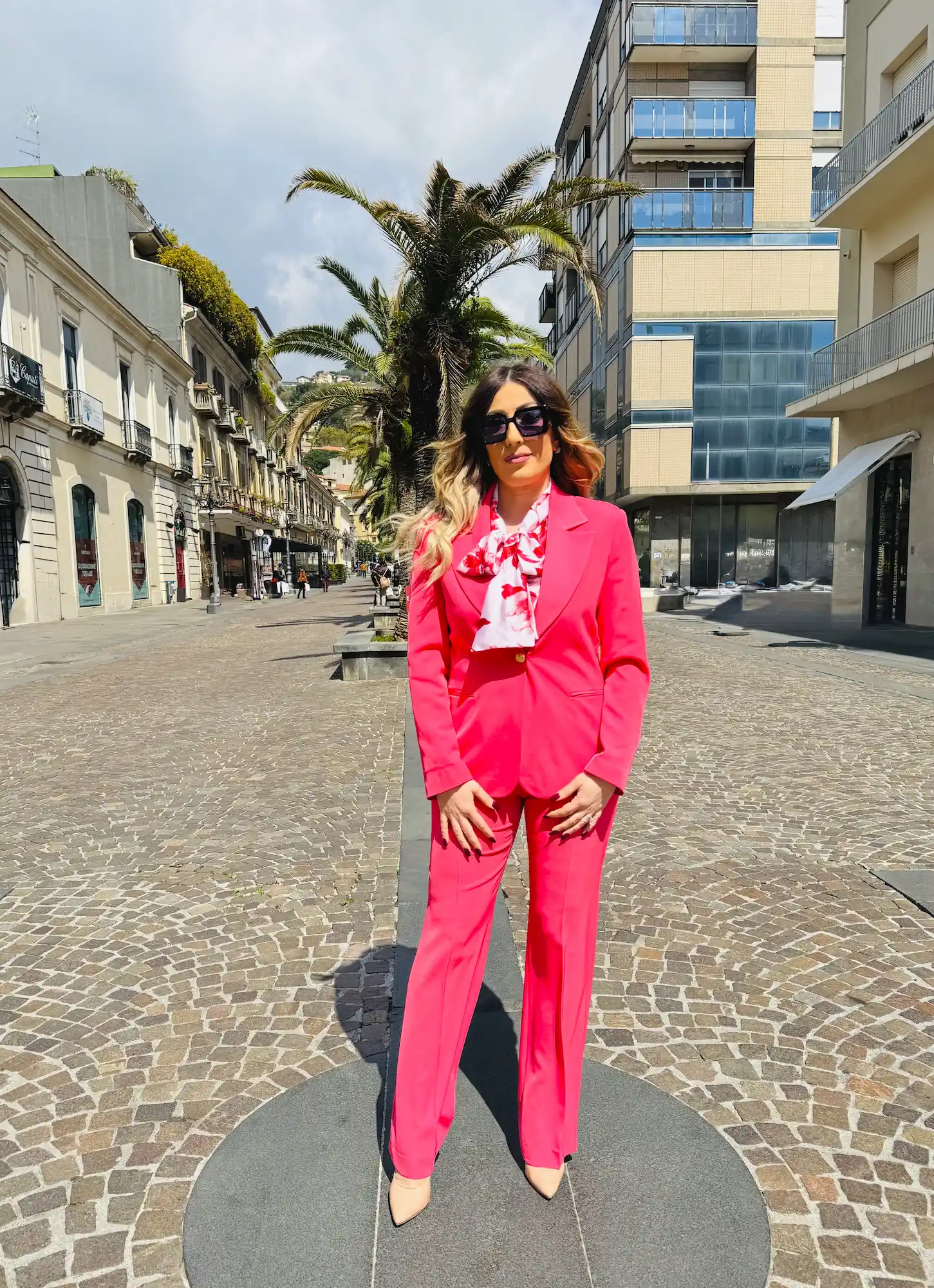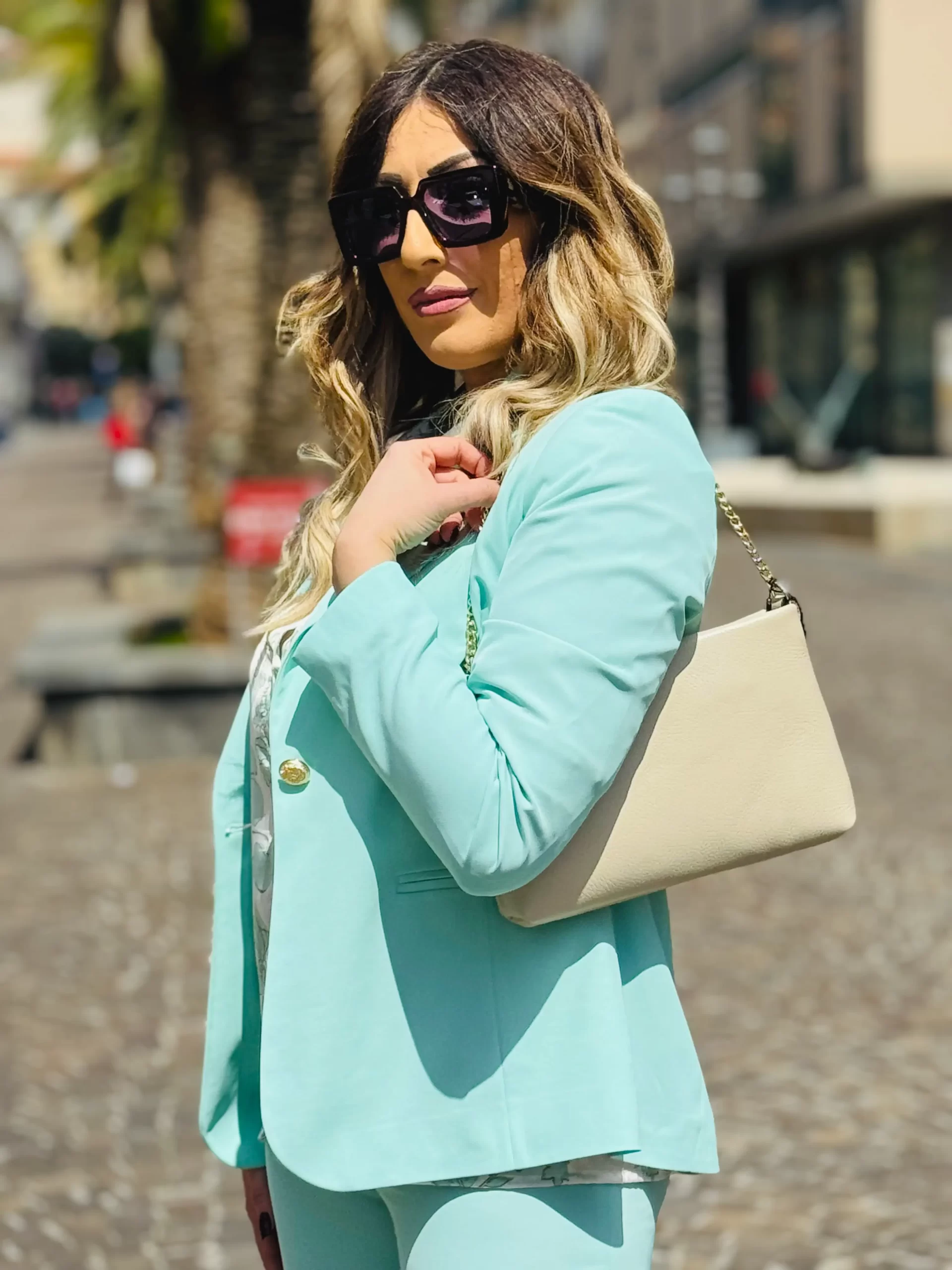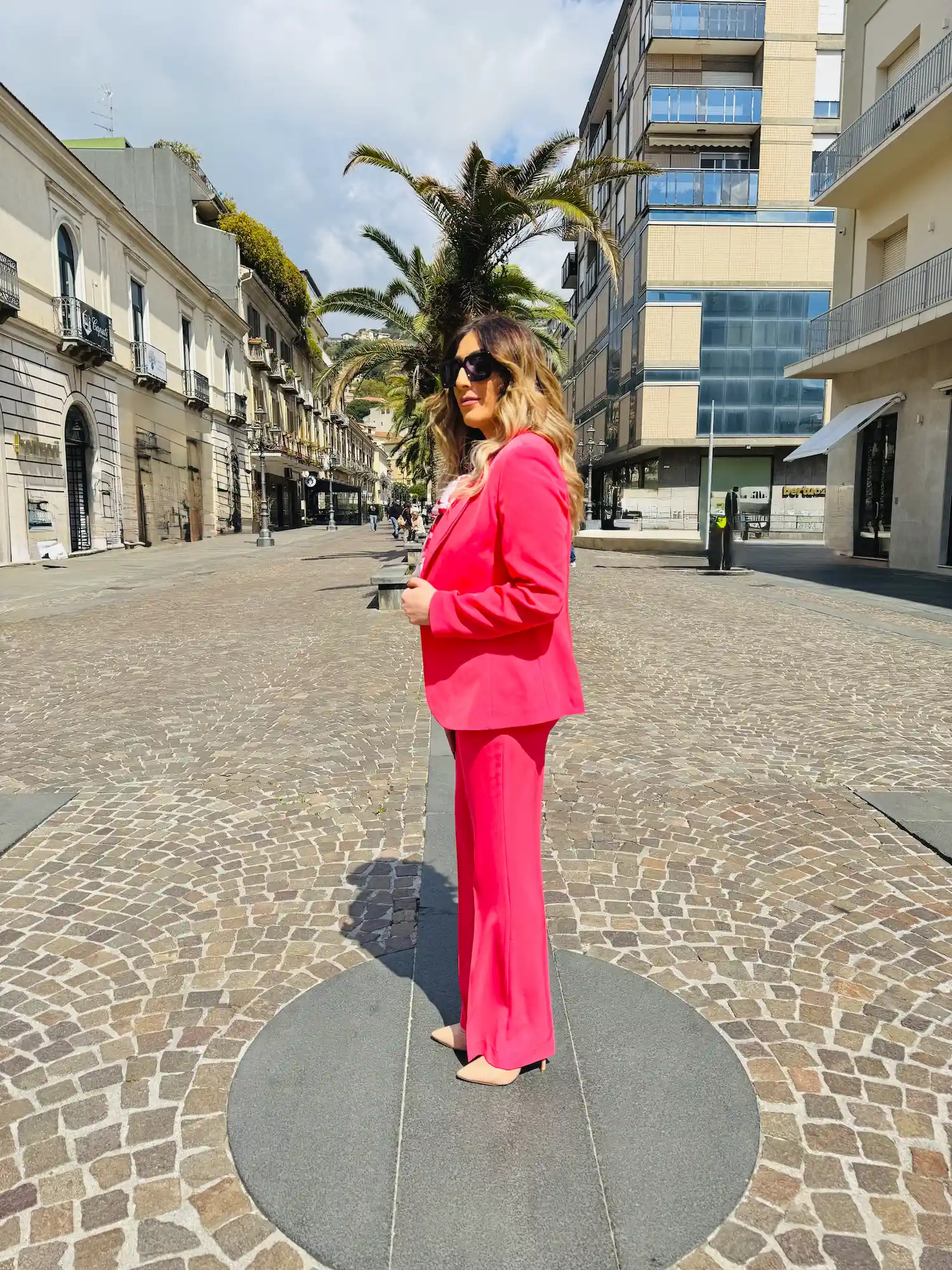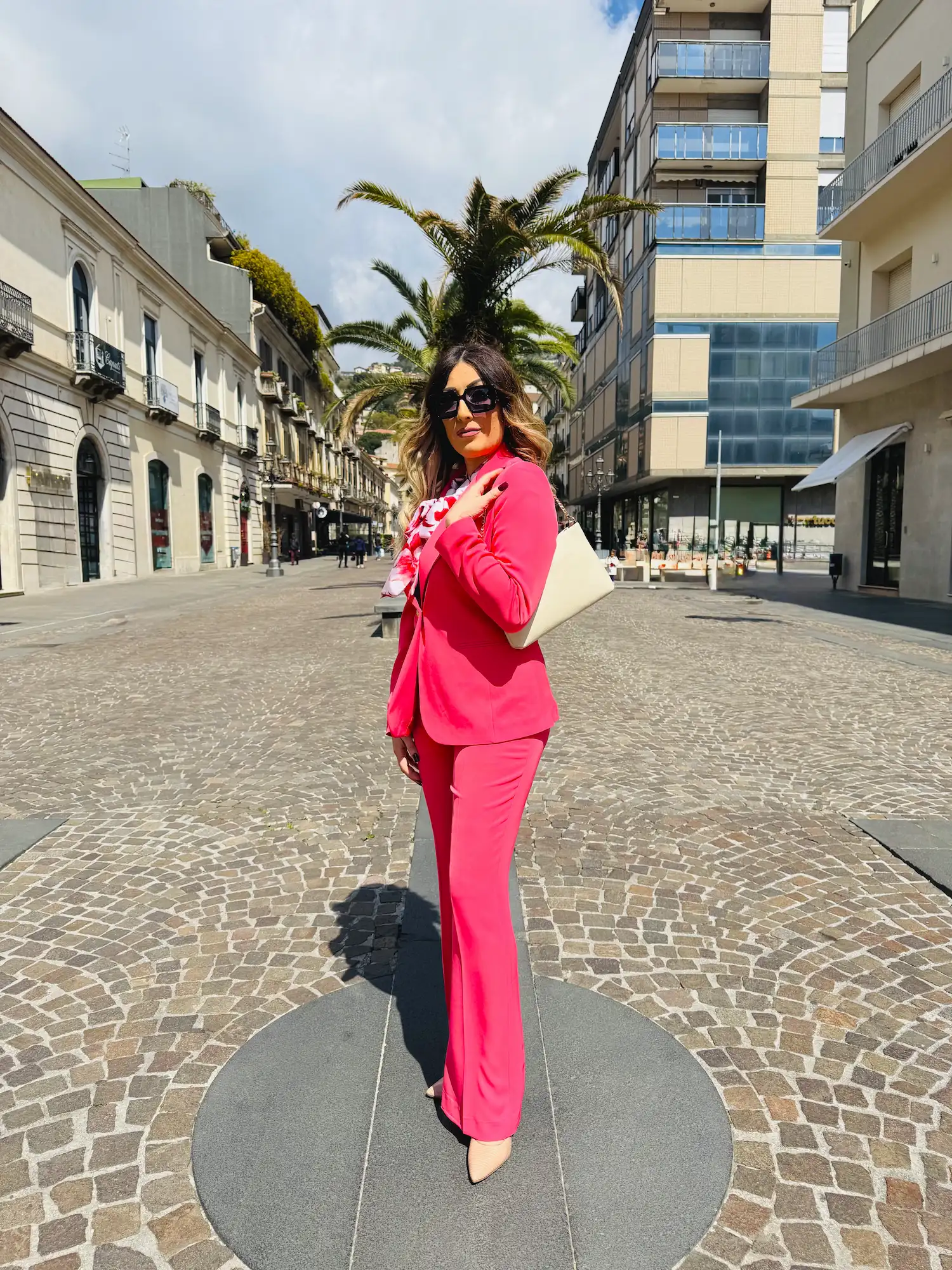 • Tailleur monopetto composto da giacca e pantalone. La giacca, interamente foderata, è caratterizzata da un solo bottone e tasche a filetto. Il pantalone è a vita alta, modello a zampa, senza tasche.
